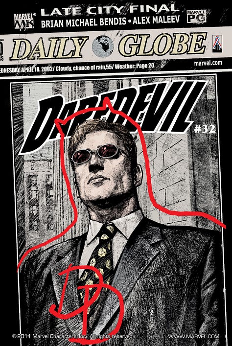La série estampillée Marvel Knights profite ensuite des magnifiques travaux de peinture de David Mack avant d’être reprise par Brian Michael Bendis et Alex Maleev. Son ton devient dès lors extrêmement sombre, l’atmosphère oppressante, et la partie graphique se rapproche de ce que l’on a pu connaître sur le label Vertigo de DC quelques années plus tôt. Nous sommes ici très loin des comic books de super-héros mainstream auxquels le lectorat est habitué à se frotter. Bendis et Maleev adoptent un réalisme brutal et sans concession, renouant à la puissance dix avec le New-York malfamé et suintant de Frank Miller.