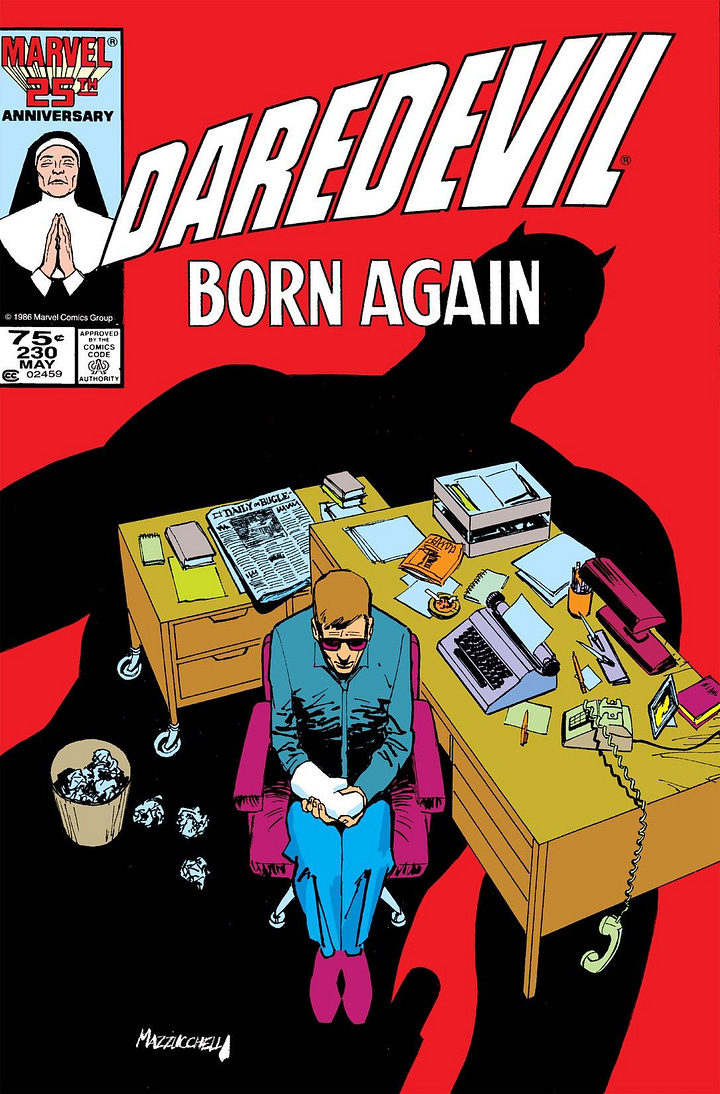Frank Miller quitte Daredevil en 1983 avec le cent-quatre-vingt-onzième numéro, mais pas pour très longtemps. Après un court passage de Dennis O’Neil en tant que scénariste, Miller revient en 1985, cette fois-ci uniquement à l’écriture, accompagné de David Mazzucchelli au dessin, pour un récit qui reste encore aujourd'hui un classique absolu : Born Again.