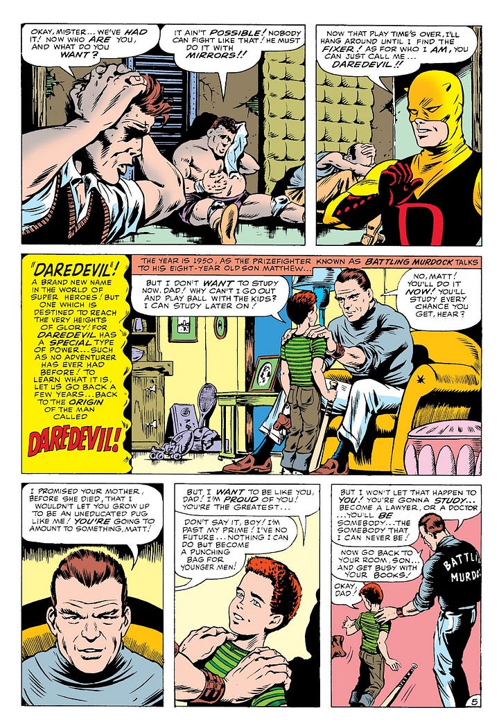 Dès ce premier numéro, les bases sont posées, de manière aussi succincte qu’efficace, et tout ou presque est déjà là. Matthew Murdock, fils du boxeur Battlin’ Jack Murdock, perd la vue en sauvant un aveugle qui allait être renversé par un camion transportant des matières radioactives. Si l’accident le prive de l’un des cinq sens, il décuple étrangement les autres et dote également le jeune Matt d’un pouvoir compensant en partie son handicap : une sorte de sens radar, que l’on comparera plus tard à celui des chauves-souris.