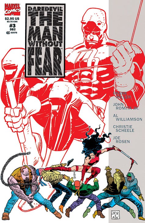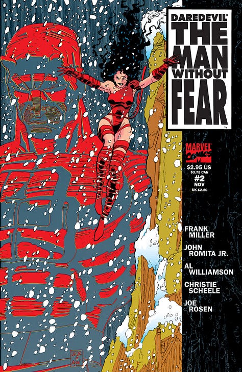 En 1993, Frank Miller revient, accompagné de John Romita Jr. et Al Williamson, pour Daredevil : The Man Without Fear, une mini-série en cinq numéros qui réinvente les origines du héros et narre en profondeur ses premiers pas de vigilant masqué. C’est l’occasion pour Miller de retrouver ses créations, comme Stick, le mentor de Matthew, mais aussi Elektra, et de réimaginer l’origin story de Daredevil ; ou plutôt, de l’enrichir, tout en restant très fidèle aux grandes lignes de la première vision de Stan Lee et Bill Everett.