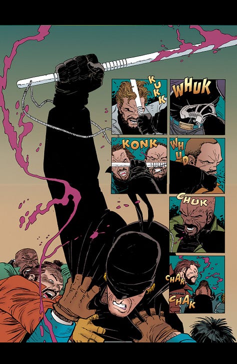 Dans le run de Miller, il y a une planche où Daredevil, épuisé par un combat avec Bullseye, pourrait se contenter de laisser mourir son ennemi juré sur les rails du métro. Mais, au dernier moment, il puise dans ses ultimes ressources pour sauver son adversaire de toujours, sans savoir qu’il le regrettera bien assez tôt. Pour moi, c’est l’essence même de ce qui fait L’Homme Sans Peur.