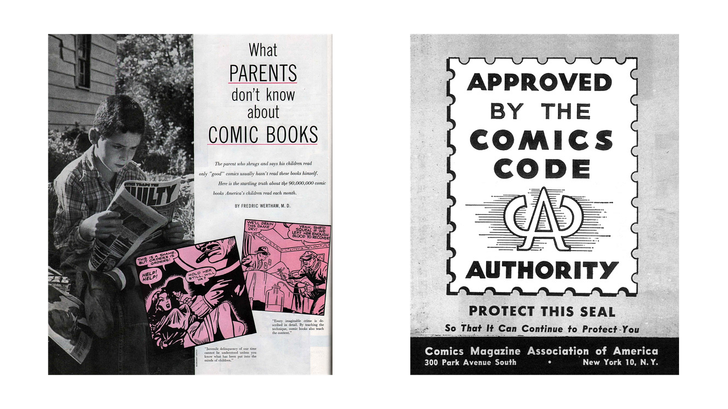 Car entre temps, le monde de la bande dessinée américaine a changé. Au début des années 1950, l’Amérique cherche un nouveau bouc émissaire à qui attribuer la hausse des chiffres de la délinquance. Sous l’impulsion de livres comme Seduction of the Innocent de Fredric Wertham, de la commission menée par le sénateur Estes Kefauver, et du magistrat Charles F. Murphy, les comic books se retrouvent au centre de l’attention comme grands responsables de la déchéance de la jeunesse qui sombre peu à peu dans la criminalité.