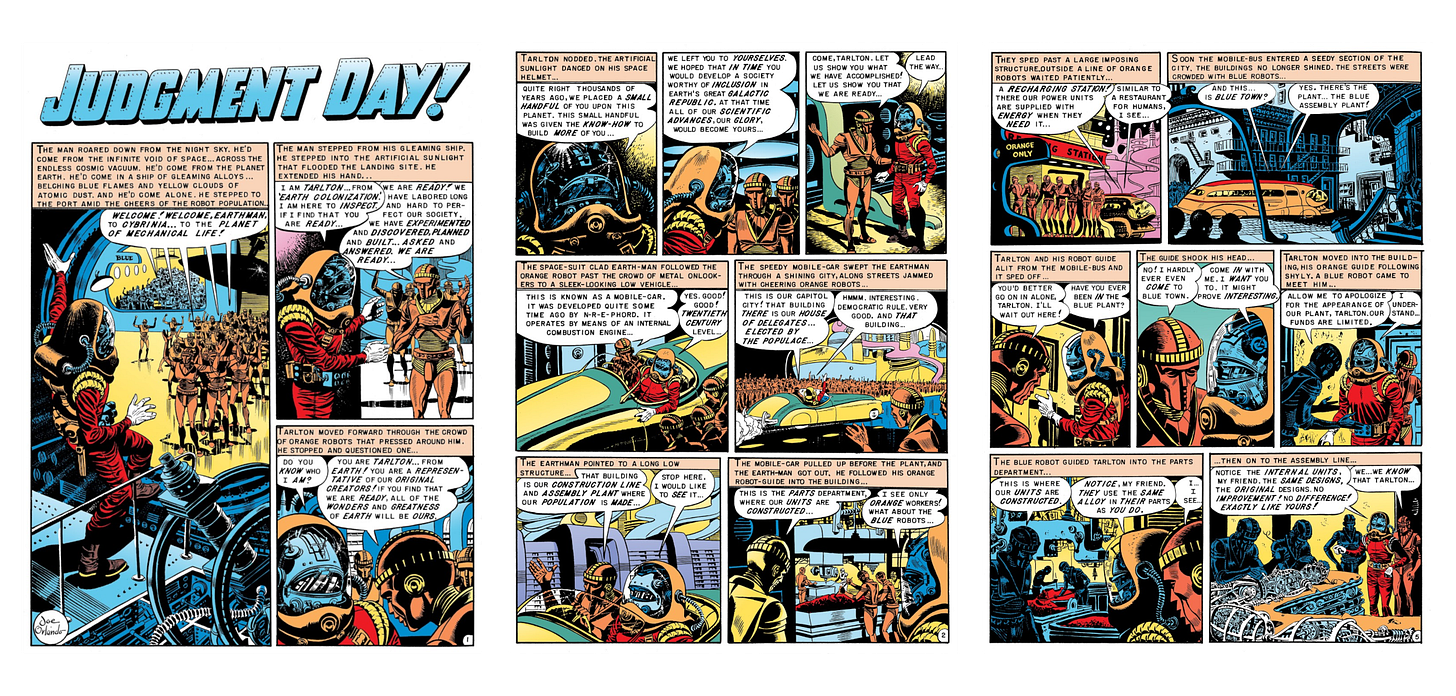 Paru pour la première fois dans le dix-huitième numéro de Weird Fantasy, Judgment Day, écrit par Al Feldstein et dessiné par Joe Orlando, est un récit typique de l’époque.