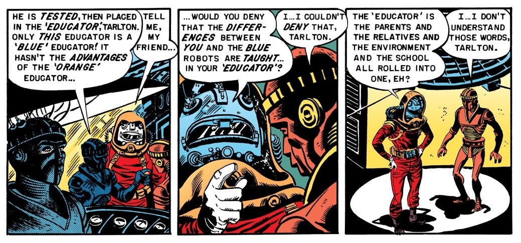 Une fois à Blue Town, Tarlon demande à visiter l’usine dans laquelle les robots bleus sont fabriqués et il découvre, assez étonné, que le procédé est tout à fait identique à celui des robots orange, excepté la phase d’éducation, durant laquelle les robots bleus sont conditionnés pour être serviles et rester cantonnés aux tâches les plus ingrates, alors qu’il n’existe aucune justification à cela.
