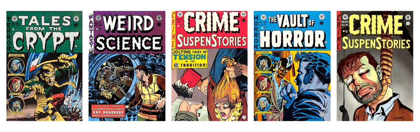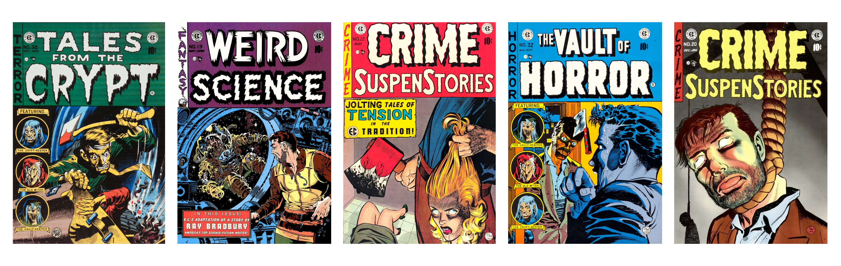À partir de 1950, les périodiques de EC Comics se transforment peu à peu en poussant les curseurs toujours plus loin. Les histoires policières mettent en scène des meurtres sordides toujours plus gores, et les comic books de guerre ou de romance sont renommés pour devenir des magazines d’horreur ou de science-fiction remplis de monstres et présentant plusieurs courtes histoires caractérisés par leur chute toujours plus choquante !