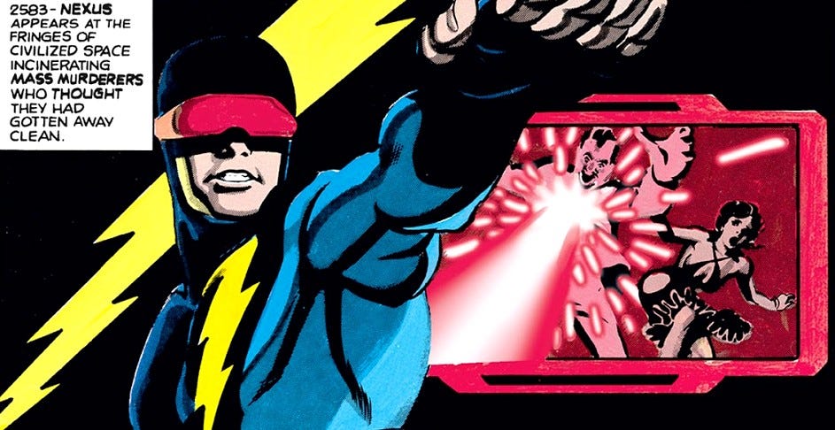 Si cette règle à tendance à disparaître dans les années 1980, pour pratiquement s’inverser dans la décennie suivante qui fait la part belle aux anti-héros ultra-violent comme Spawn ou Wolverine, Nexus fait partie des premiers exemples de personnage traité comme un héros alors qu’il est ouvertement chargé d’exécuter des êtres vivants.