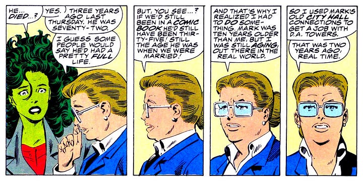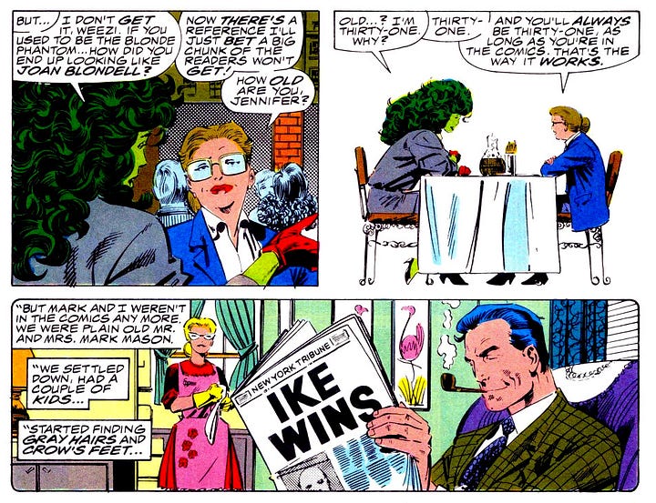 Il faut donc finalement attendre 1989 pour revoir Louise Grant dans le quatrième numéro de The Sensational She-Hulk. Elle y apparaît plus âgée, et surtout, on apprend qu’elle s’est mariée avec Mark Mason en 1949, juste après l’arrêt de la publication de sa série, adoptant ainsi officiellement le nom de Louise Grant Mason.