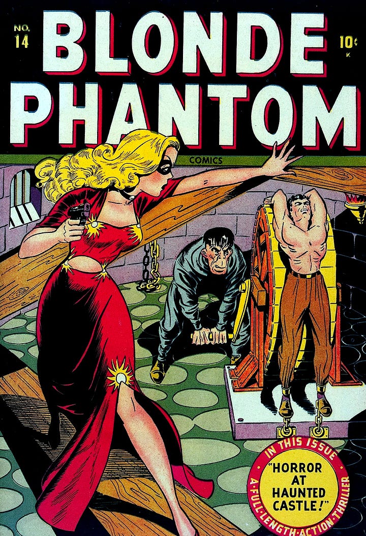 Blonde Phantom est un vrai personnage de bande dessinée, dont les aventures ont été publiées par Timely Comics, l’ancêtre de Marvel, à partir de 1946. Créée par le scénariste Al Sulman et par le dessinateur Syd Shores à la demande de Stan Lee qui trouvait que les publications Timely manquaient de super-héroïnes, elle fait sa première apparition dans All Select Comics #11, un périodique qui sera d’ailleurs renommé Blonde Phantom dès le numéro suivant.