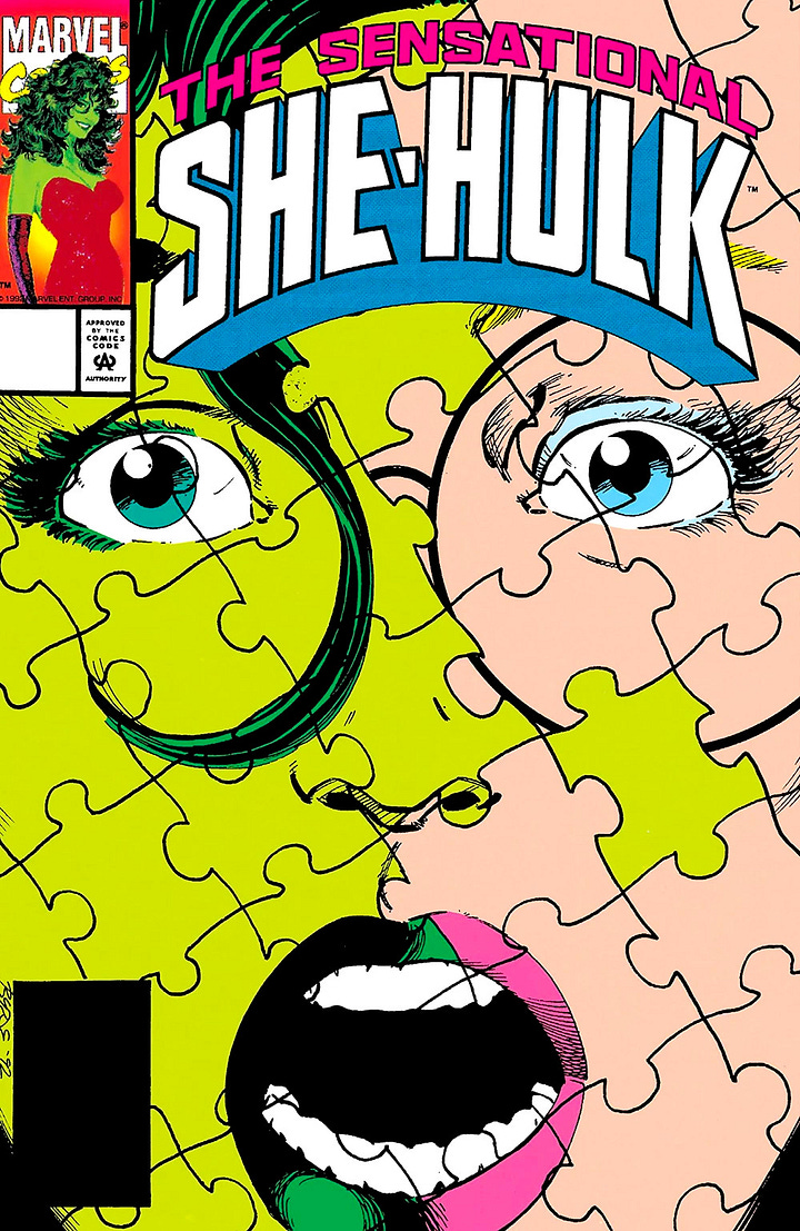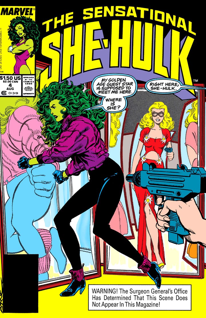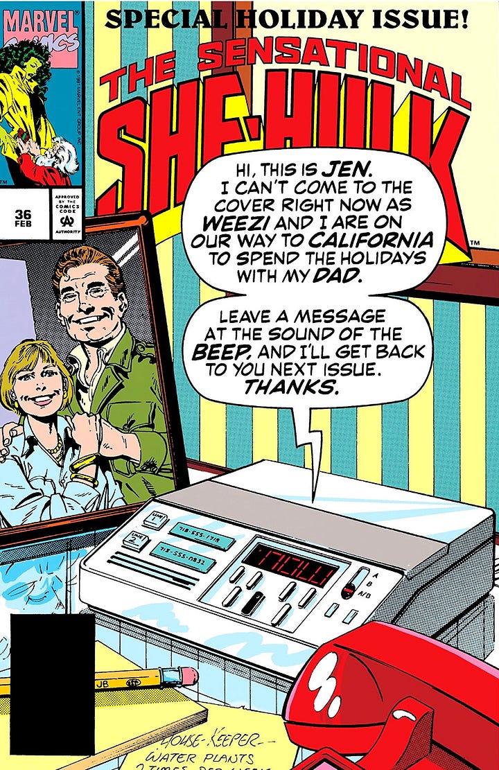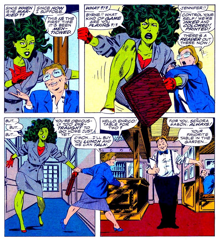 Dès la couverture du premier numéro, Byrne annonce la couleur. Jennifer Walters s’y adresse directement au lecteur, menaçant de déchirer leur collection de comics X-Men s’ils n’achètent pas sa série. Le ton est donné : She-Hulk est devenu un personnage conscient de sa condition d’héroïne de comic book et elle va dorénavant régulièrement briser le quatrième mur.