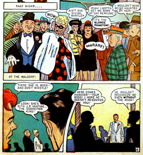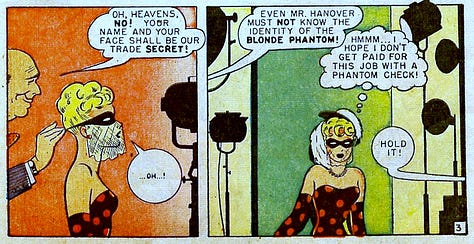 Elle qui ne rêve que de gloire et de paillettes est alors totalement anonymisée derrière un masque et une robe noire à pois rouges, ne pouvant pas profiter des retombées du succès du fameux sent-bon pour faire décoller sa carrière ! Vous l’aurez compris, exception faite du cadre et des enjeux, cette Blonde Phantom ressemble drôlement à celle qui prendra conscience de son statut de personnage de comics quelques décennies plus tard.