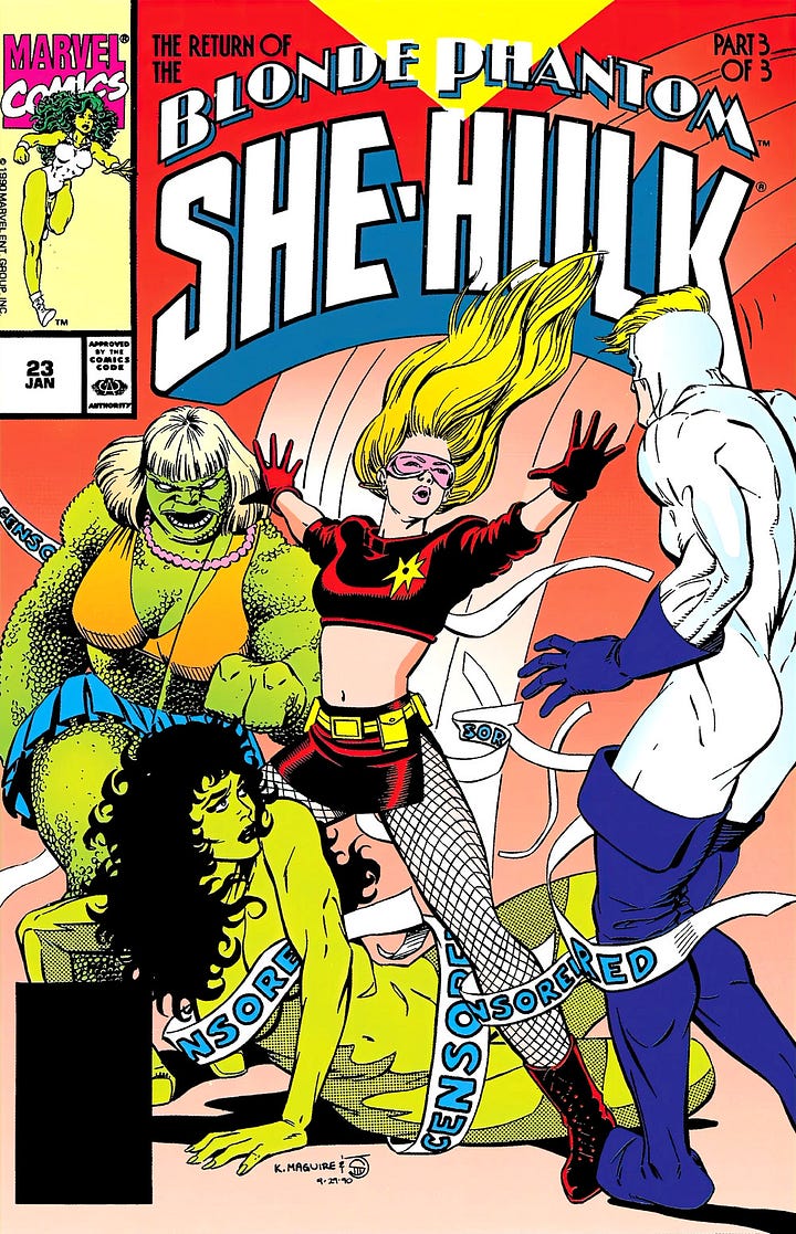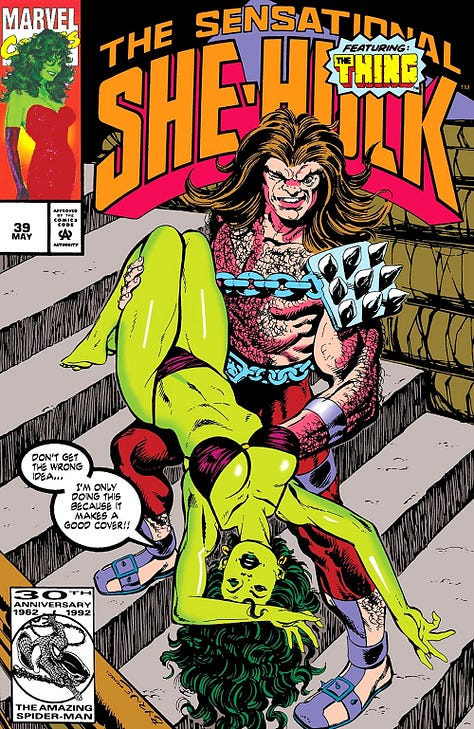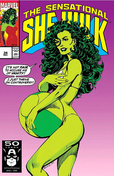 John Byrne reviendra finalement sur The Sensational She-Hulk, continuant de jouer avec les codes du comic book, comme le faisait Grant Morrison avec sa Doom Patrol à la même période, et livrant par la même occasion des couvertures désopilantes se rangeant parmi les meilleures de l’histoire de la bande dessinée américaine.