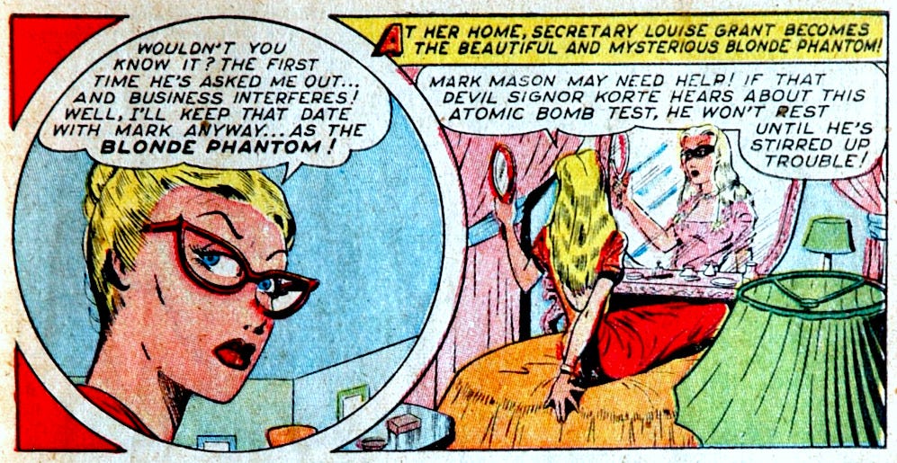 Qu’une justicière costumée apparue seulement à deux mois d’intervalle chez le même éditeur porte exactement le même nom et un costume vaguement ressemblant pourrait très bien être une amusante coïncidence, tout comme le fait que Millie et Louise partagent pas mal de points communs, dont celui d’être ignorées par un love interest qui est aussi leur supérieur hiérarchique. Mais les similitudes ne semblent plus si fortuites quand l’on découvre que Al Sulman, le co-créateur de la super-héroïne Louise Grant, relisait régulièrement de nombreux scripts pour Timely. Tandis que Ken Bald, dessinateur sur Millie the Model, comptait parmi les artistes au sommaire du numéro de All Select Comics où apparaît pour la première fois Blonde Phantom, cette fois au dessin des aventures de Miss America.