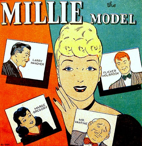 Créée par Ruth Atkinson pour Timely Comics en 1945, Millicent Collins, alias Millie the Model, est un jeune mannequin dont les aventures, entre romance et humour, vont connaître une longévité assez exceptionnelle. Fruit des demandes de l'éditeur Martin Goodman, qui cherchait à surfer sur le succès des séries dérivées de l’univers de Archie publiées par son concurrent MLJ, Millie the Model va occuper les présentoirs des kiosques américains jusqu’en 1973, et va même connaître plusieurs spin-offs.