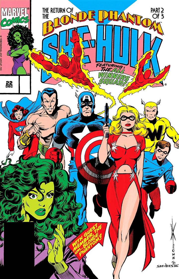 Car, comble du méta à la sauce Byrne : en sortant de sa retraite pour ne pas mourir oubliée du lectorat, Blonde Phantom est devenue elle-même responsable du renouveau de son statut au sein de l’univers Marvel et de l’enrichissement a posteriori de son background et de son passé de justicière. Steve Gerber et Buzz Dixon, remplaçant au pied levé John Byrne éjecté de The Sensational She-Hulk par un Tom DeFalco irascible, donneront à Louise une héritière costumée en la personne de sa fille Wanda, qui deviendra l’héroïne Phantom Blonde. Et la magie de la rétro-continuité lui permettra même de vivre des aventures à rebours, comme dans la mini-série Avengers 1959 de Howard Chaykin, parue en 2011.