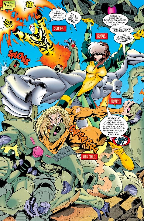 C’est d’autant plus vrai que ce crossover mélange à la fois les ingrédients typiques des comic books de la première moitié de la décennie 90, avec ses anti-héros sombres et bad-ass aux dégaines improbables, et un ton plus mature et critique qui, s’il était déjà propre aux X-Men de Chris Claremont, va avoir tendance à se diffuser largement dans la bande dessinée de super-héros à l’aube du XXIe siècle.